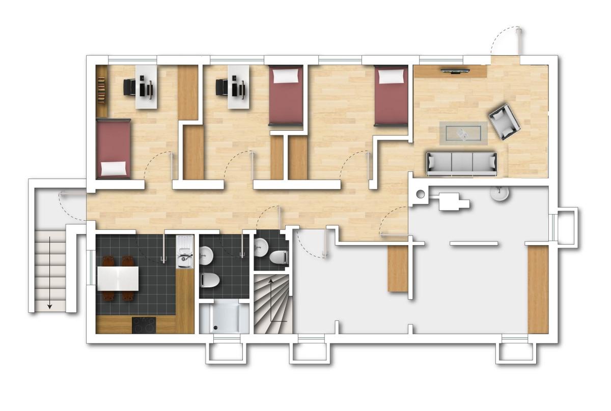 Das Untergeschoss ist mit vier weiteren hellen Zimmern, einer Küche, einem Badezimmer mit Dusche und Waschbecken sowie einem separaten WC ausgestattet.