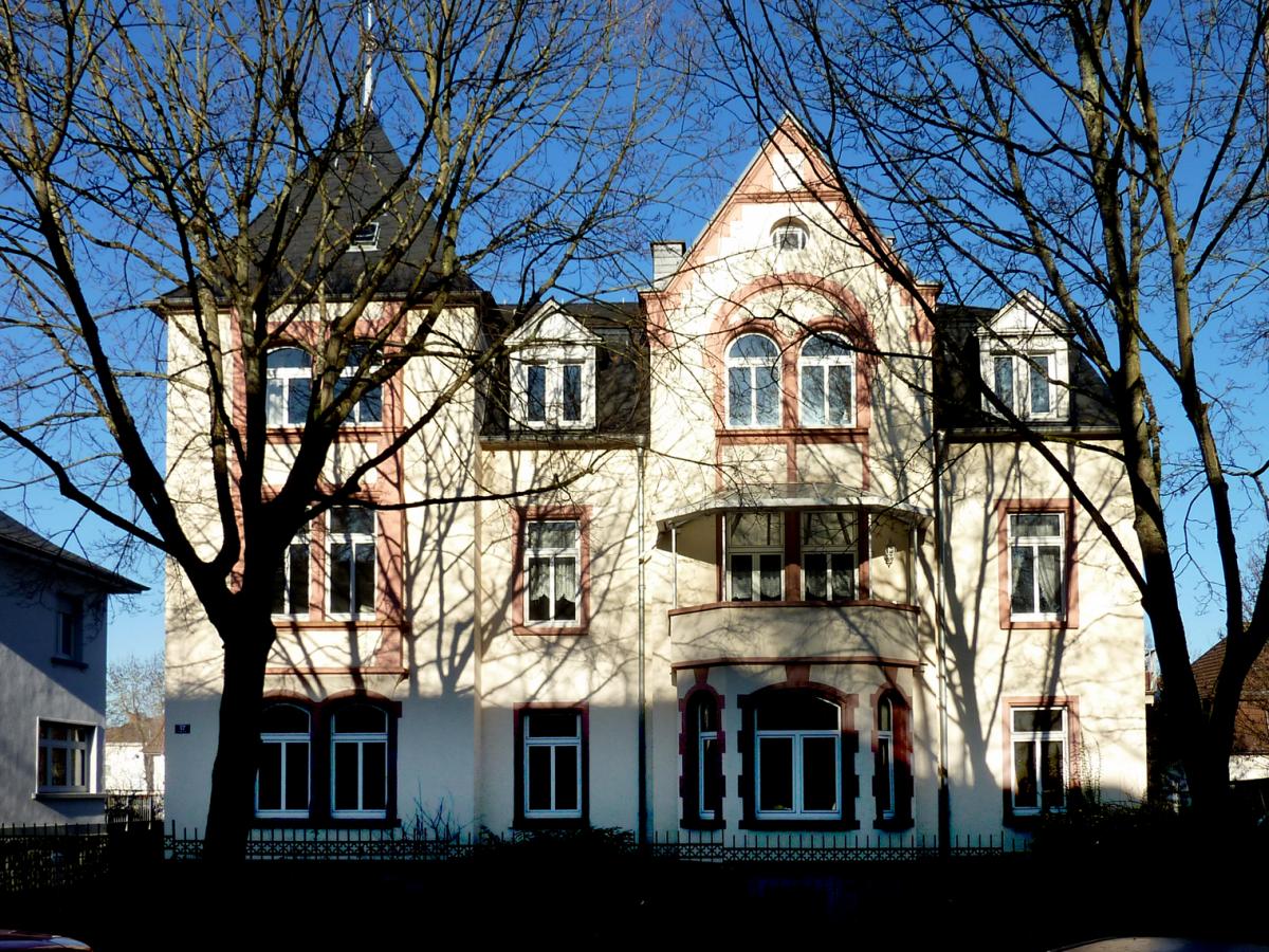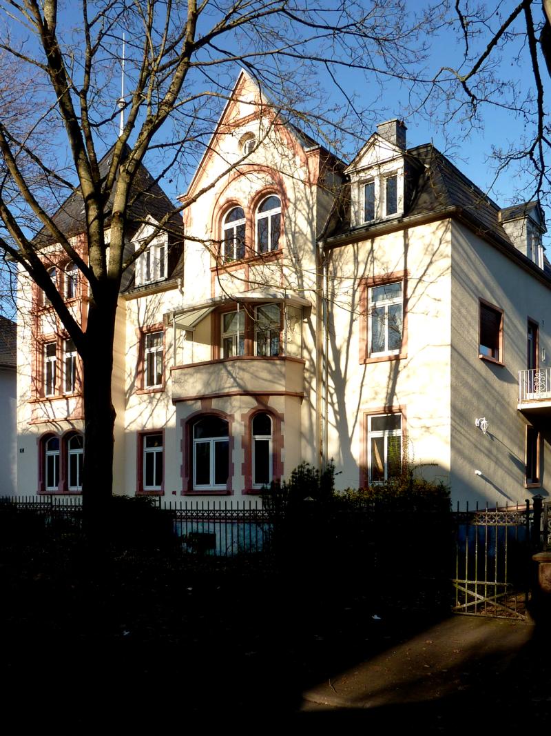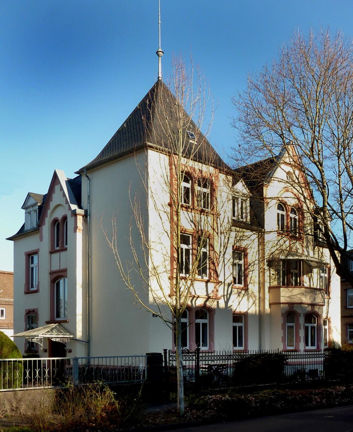 Das Vorzeigeobjekt wurde um 1905 grundlegend im historisierenden Sinne überformt und repräsentativ durch zwei Risalite (links turmartig), durch einen vorgelagerten halbrunden Erkerbalkon und einen Ziergiebel ergänzt. Der so entstandene, etwas heterogene Bau wirkt in erster Linie durch den wunderschönen Kontrast zwischen Sandstein und Putz. Dekorativ sind auch die teils rundbogigen Fensterfassungen, das Zwillingsfenster mit überfangendem Rundbogen, das Treppenmotiv des Giebels und die gläserne Verdachung des Balkons. Zusammen mit der originalen Einfriedung und dem Vorgarten gilt diese Immobilie als Kulturdenkmal aus städtebaulichen Gründen.
