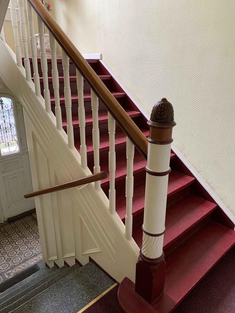 Der Eingangsbereich der Immobilie ist überdacht, eine wunderschöne Eingangstür mit Glasarbeiten empfängt die Bewohner. Durch diese betreten Sie den Flur mit sehr schönem Treppenhaus und altem Holzhandlauf.