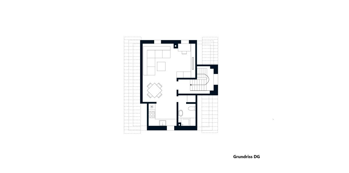 Das Dachgeschoss beherbergt eine kompakte, aber sehr gut geschnittene Ein-Zimmer-Wohnung mit einer Fläche von ca. 31,40 m². Der offen gestaltete Wohn- und Schlafbereich wirkt durch seine Großzügigkeit und die durchdachte Raumaufteilung besonders freundlich. Eine kleine Kochecke sowie ein separates Badezimmer mit Dusche, Waschbecken und WC vervollständigen dieses gemütliche Apartment.