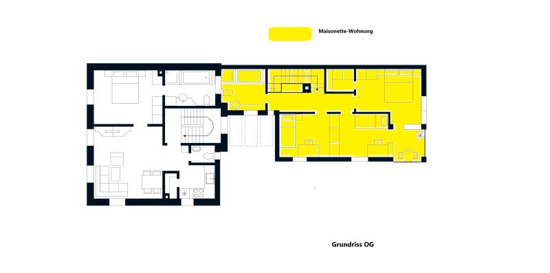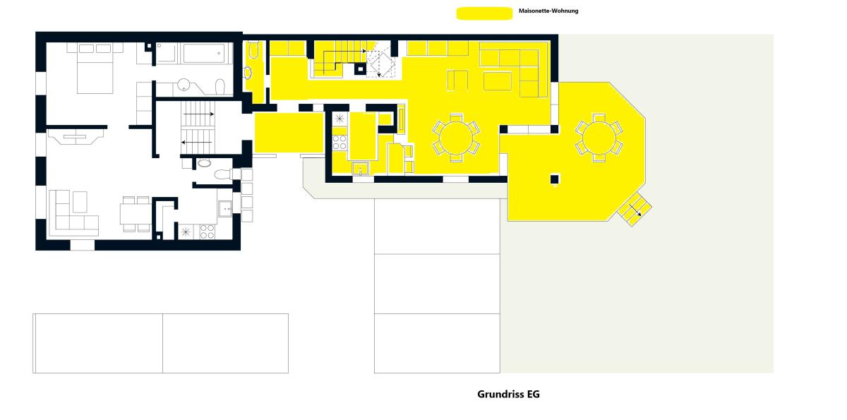 Der Anbau beherbergt die vierte Wohneinheit – eine großzügige Maisonette-Wohnung mit ca. 95,61 m² Wohnfläche und insgesamt vier Zimmern. Das Erdgeschoss dieser Einheit bildet das Herzstück mit einem geräumigen Wohn- und Essbereich sowie einer separaten Küche. Vom Wohnzimmer aus hat man Zugang zu einem gemütlichen Freisitz, der zum Verweilen im Freien einlädt. Ein Gäste-WC ergänzt das Raumangebot auf dieser Ebene.