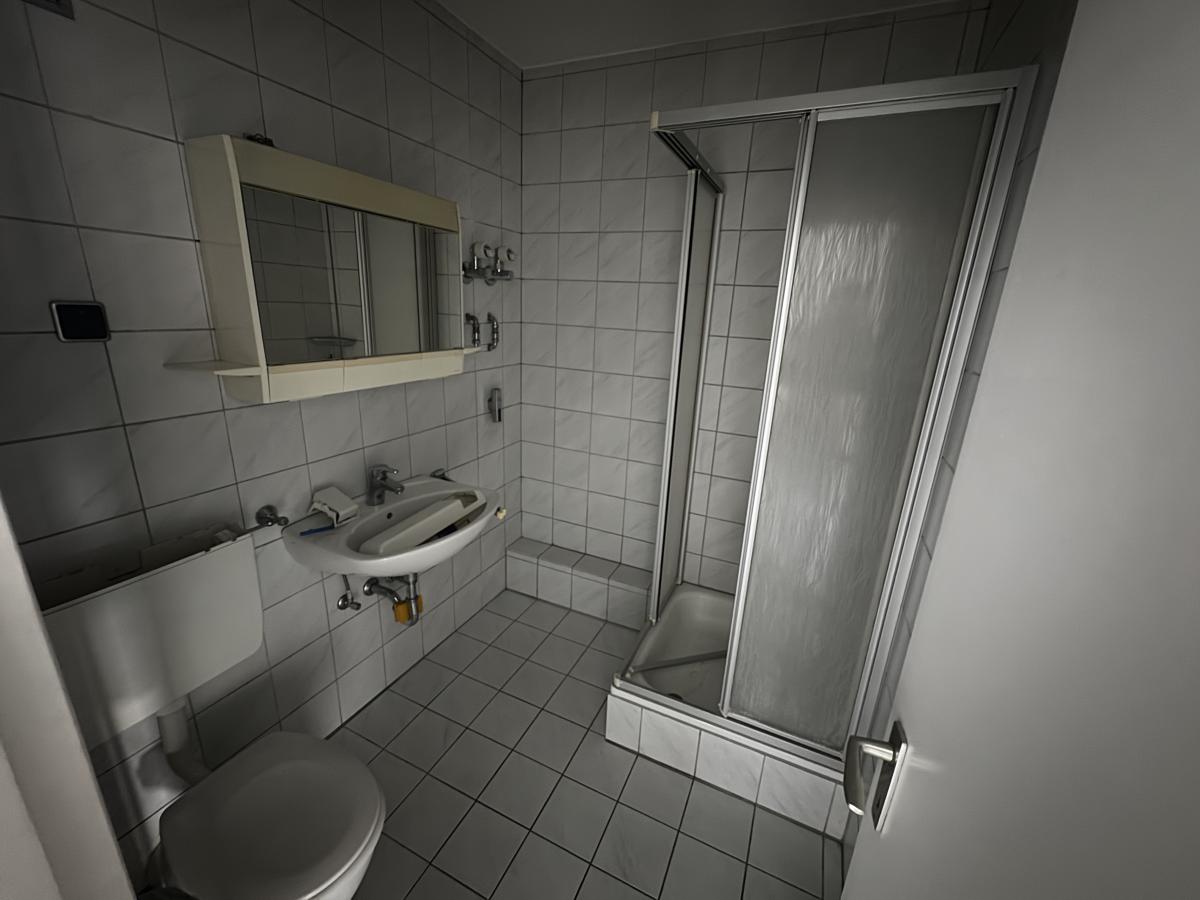 Das innenliegende Badezimmer ist angenehm hell gefliest und mit einer Dusche, einem Waschbecken sowie einem WC ausgestattet.