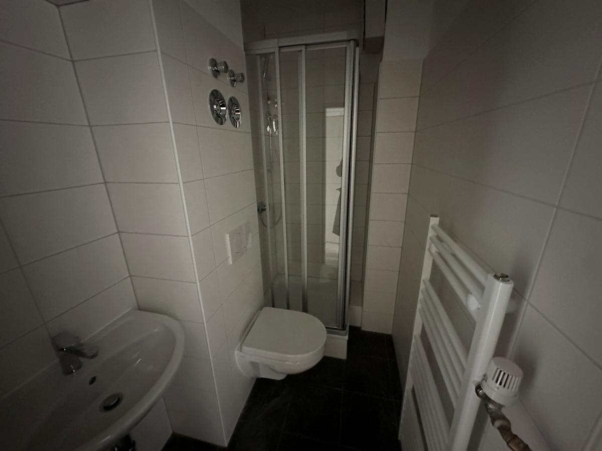 Das Badezimmer verfügt über eine Dusche, ein Waschbecken und ein WC.