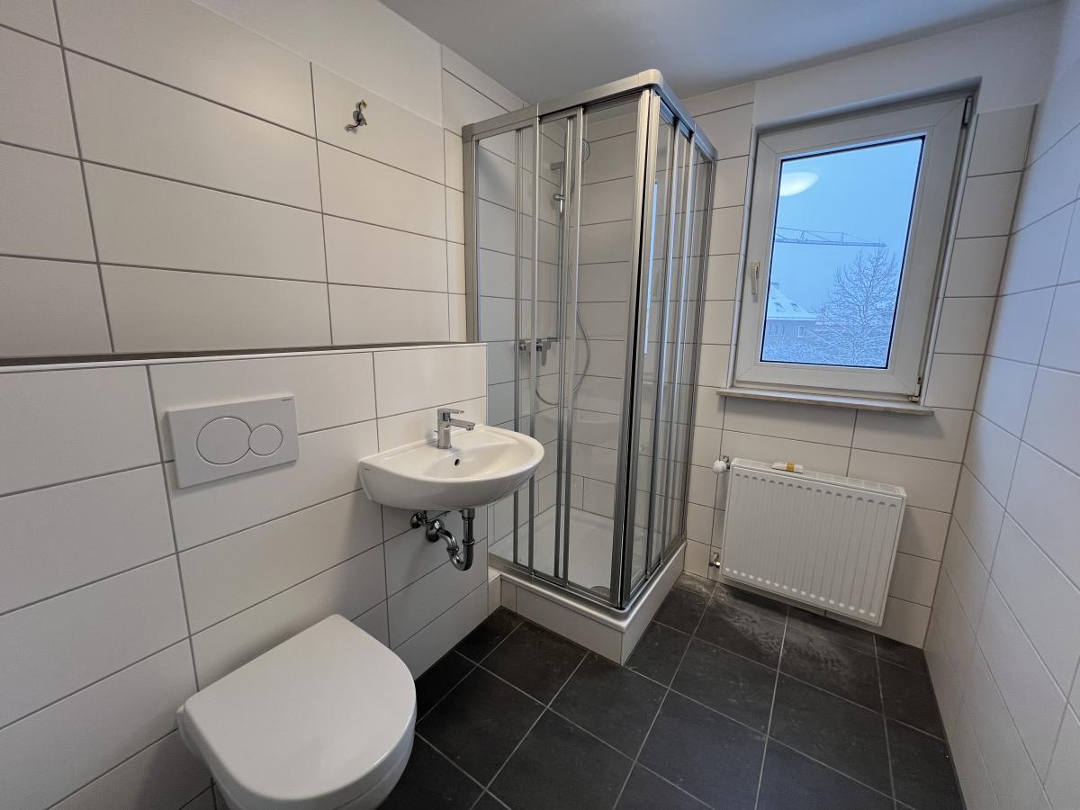 Das Badezimmer verfügt über eine Dusche, ein Waschbecken und ein WC.