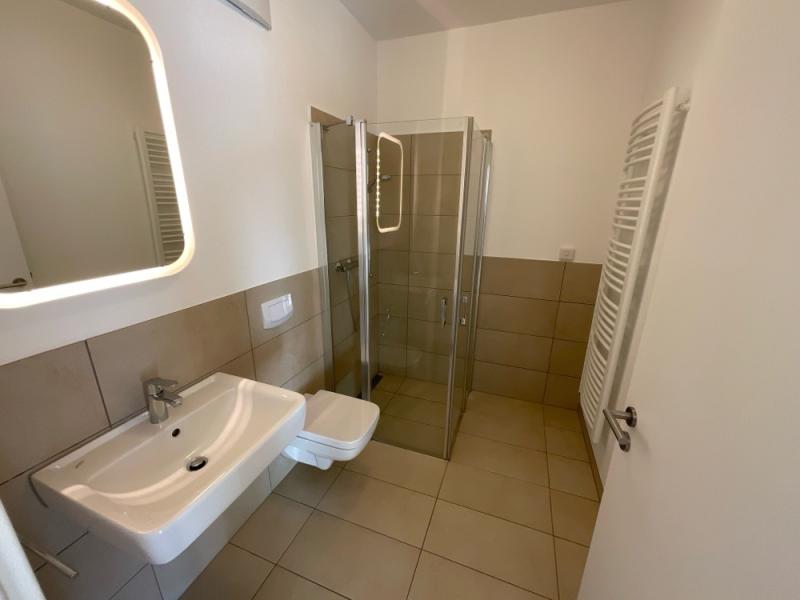 Das hochwertig gestaltete Badezimmer ist mit einer bodentiefen Dusche, einem Waschbecken und einem WC ausgestattet. Ein Handtuchwärmer sorgt für eine wohlige Wärme im Raum. Moderner Komfort vereint sich hier harmonisch mit zeitloser Eleganz.