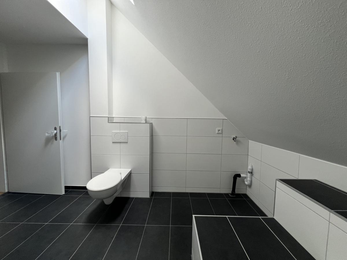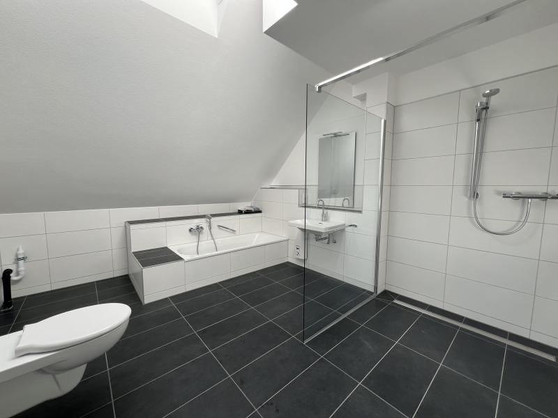 Ein modernes, großzügiges und rollstuhlgerechtes Tageslichtbad mit ebenerdiger Dusche, einem Waschbecken und einer Toilette komplettiert das Wohlfühlambiente dieser charmanten Wohnung. Auch eine Badewanne ist vorhanden - Momente der puren Entspannung sind hier garantiert. Schlichte, anthrazitfarbene Bodenfliesen schmeicheln der Modernität dieses Apartments.