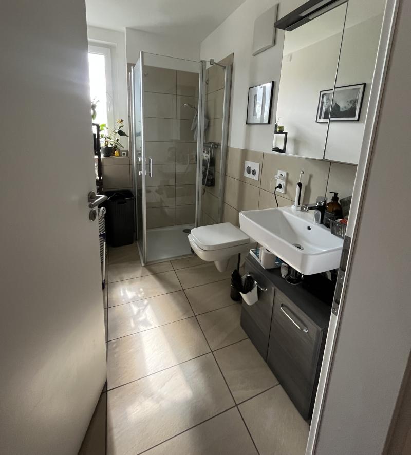 Das hochwertig gestaltete Tageslichtbad ist mit einer bodentiefen Dusche, einem Waschbecken und einem WC ausgestattet. Moderner Komfort vereint sich hier harmonisch mit zeitloser Eleganz.
