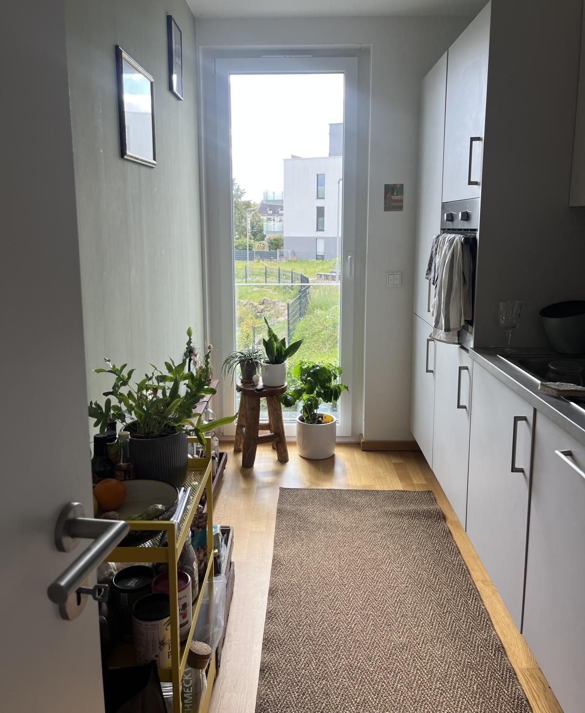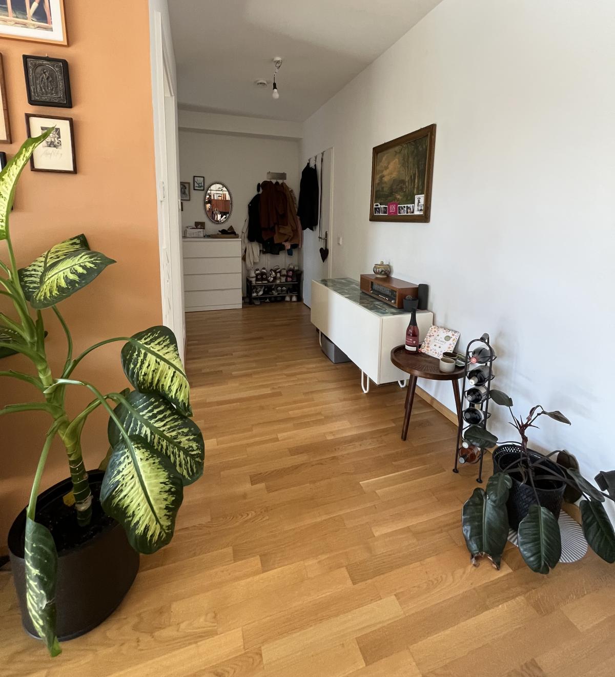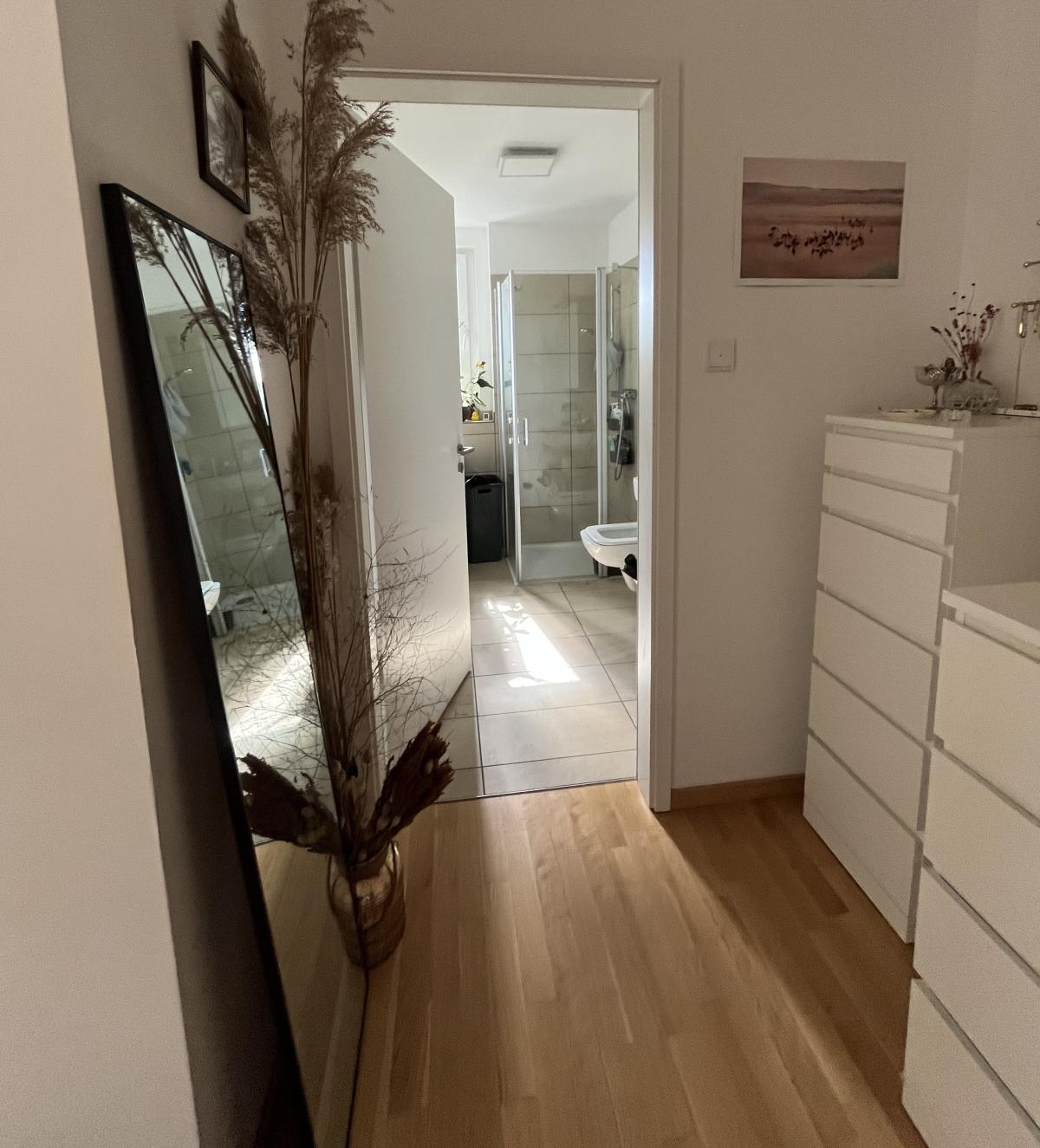 Direkt beim Betreten fällt auf, wie hell und einladend die Wohnung ist. Der Eingangsbereich bietet Platz für eine Garderobe.