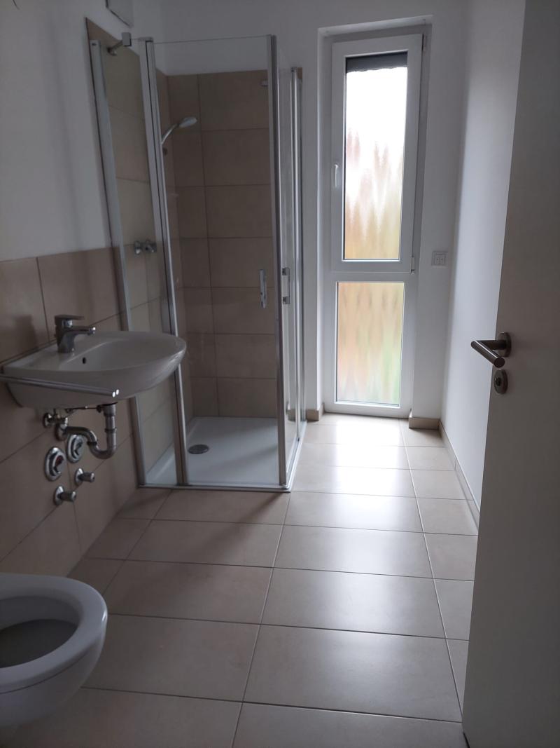 Das hochwertig gestaltete Tageslichtbad ist mit einer bodentiefen Dusche, einem Waschbecken und einem WC ausgestattet. Moderner Komfort vereint sich hier harmonisch mit zeitloser Eleganz.