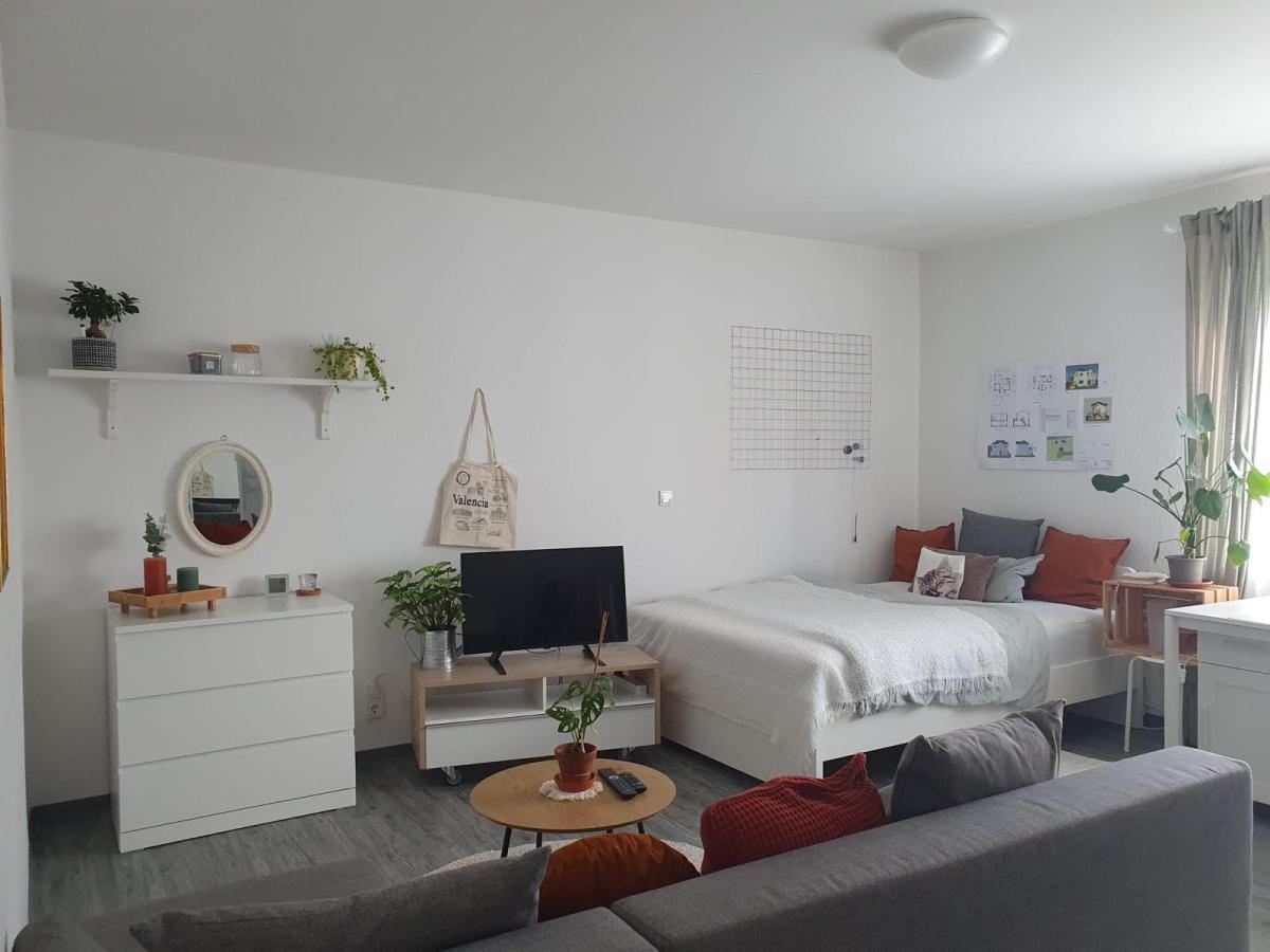 Das Badezimmer ist modern und weiß gefliest, als Bodenbelag wurden anthrazitfarbene Fliesen ausgewählt. Es gibt eine Dusche, ein Handwaschbecken sowie ein WC.