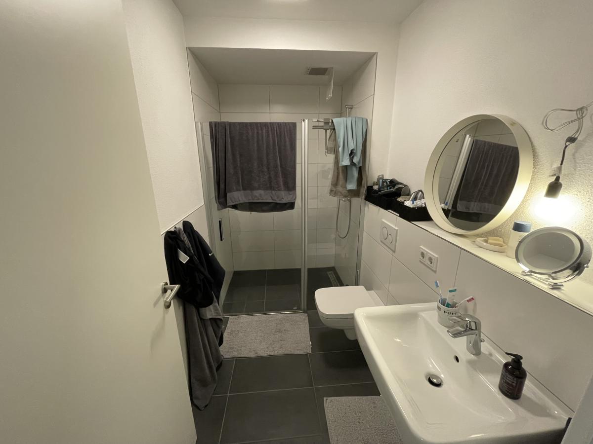 Das hochwertig ausgestattete Tageslichtbad ist mit einer bodentiefen Walk-In-Dusche, einem Waschbecken sowie einem WC ausgestattet. Liebevolle Details wie Laibungen im Duschbereich sowie oberhalb des Waschbeckens sehen nicht nur schön und zeitgemäß aus, sondern bieten zusätzlichen Raum, um zum Beispiel Kosmetika in Szene zu setzen.