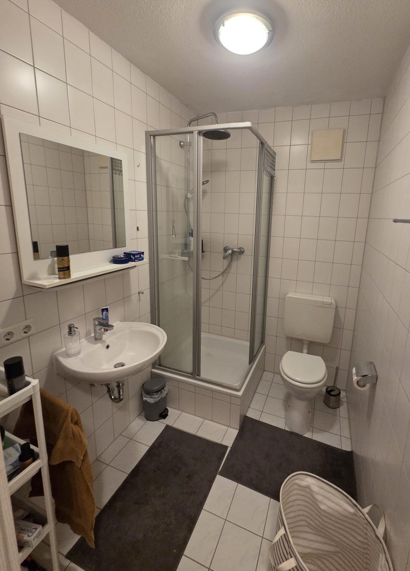 Das weiß geflieste Badezimmer bietet ein Waschbecken, eine Dusche sowie ein WC.
