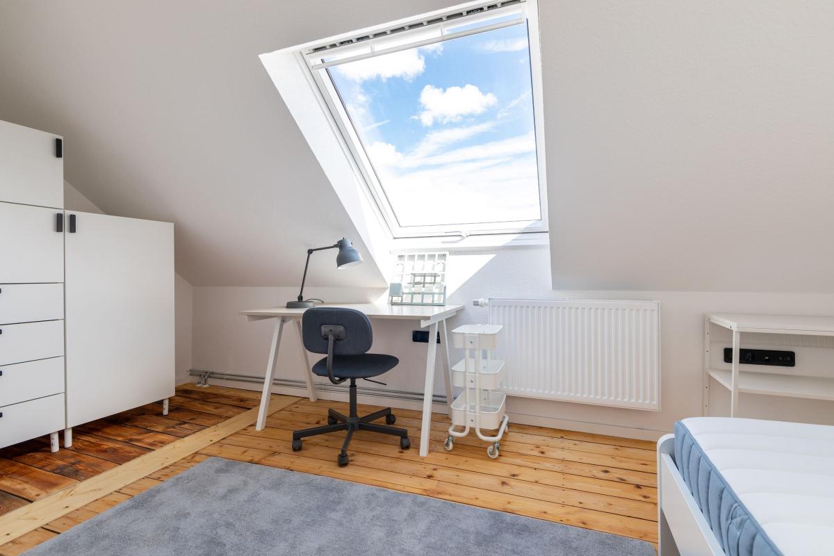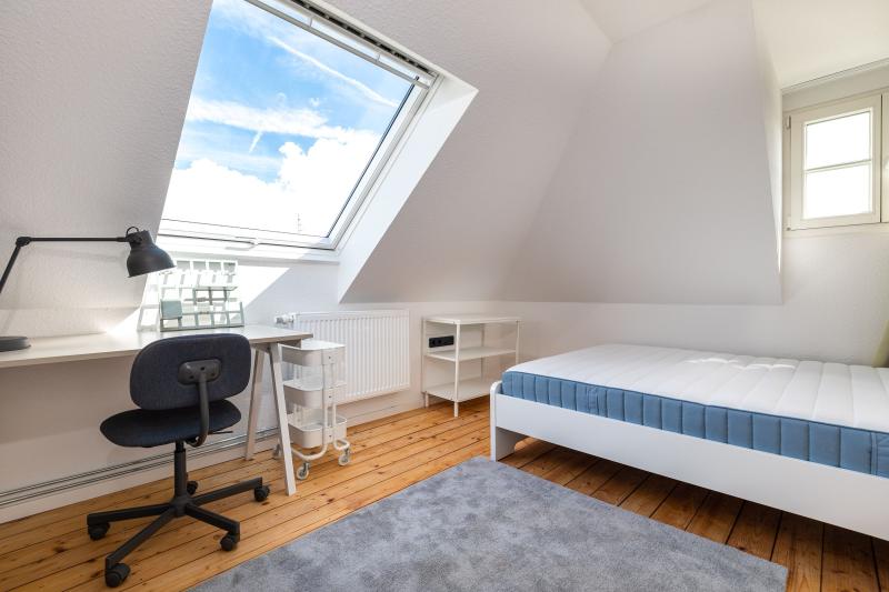 Hier wurde alles durchdacht und mit Liebe zum Detail geplant: Ein Bett, ein Kleiderschrank, ein Schreibtisch mit Drehstuhl, zwei Regale, eine Schreibtischlampe und ein Teppich komplementieren den Raum. Das vorhandene Dachschrägenfenster und die Gaube ermöglichen einen weiten Blick auf die Gießener Innenstadt und schaffen zusätzliche Lebensqualität. Ein rustikaler Holzboden sowie farbliche Akzente in Grau, Weiß und Schwarz sorgen für ein modernes, zeitgemäßes Ambiente.