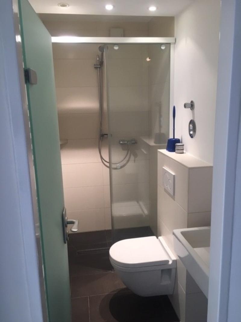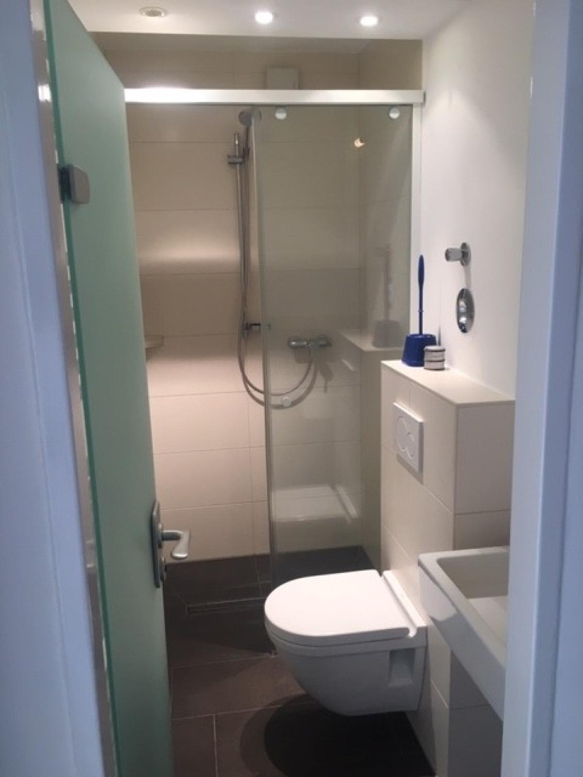 Ein modernes Badezimmer mit ebenerdiger Dusche, einem Waschbecken und einer Toilette komplettiert das Wohlfühlambiente dieser charmanten Wohnung.