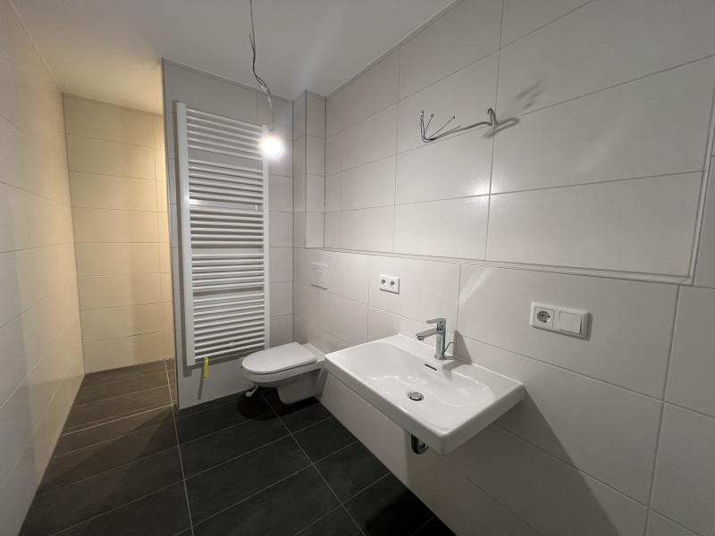 Ein modernes Badezimmer mit ebenerdiger Dusche, einem Waschbecken und einer Toilette komplettiert das Wohlfühlambiente dieser charmanten Wohnung. Schlichte, anthrazitfarbene Bodenfliesen schmeicheln der Modernität dieses Apartments. Ein Handtuchwärmer sorgt für eine angenehme Wärme im Raum.