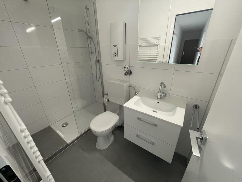 Ein modernes Badezimmer mit einer Dusche, einem Waschbecken und einer Toilette komplettiert das Wohlfühlambiente dieser charmanten Wohnung. Schlichte, anthrazitfarbene Bodenfliesen schmeicheln der Modernität dieses Apartments. Ein Handtuchwärmer sorgt für eine wohlige Wärme im Raum.