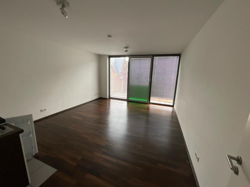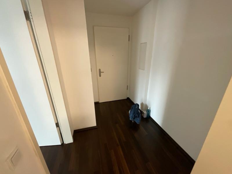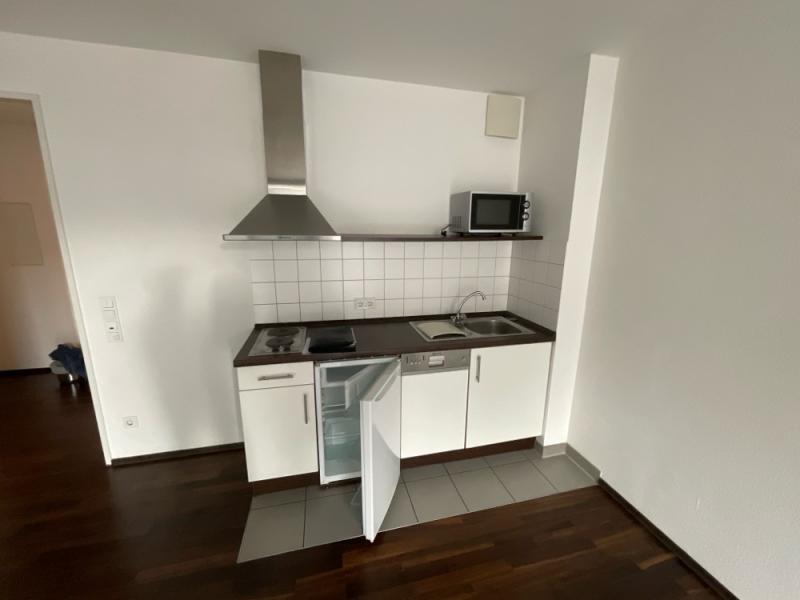 Ein kleiner Flur führt in die Wohnung. Der Wohnraum ist dank der großen Fensterfront angenehm hell und bietet zudem eine kleine Küchenzeile. Moderner Designbelag in Holzoptik und eine offene Raumgestaltung schaffen ein zeitgemäßes Ambiente.