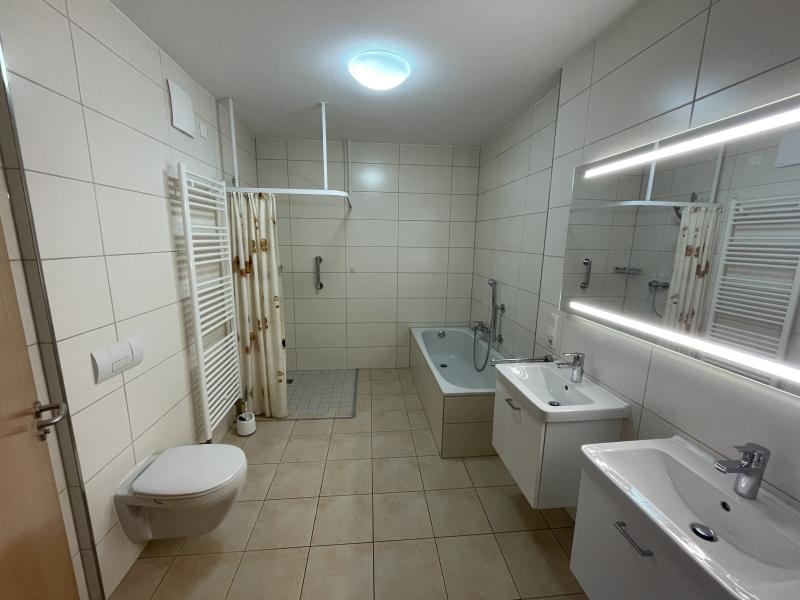 Das Badezimmer ist mit einer Badewanne, einer bodentiefen Dusche, einem Doppel-Waschbecken und einem WC ausgestattet. Zusätzlich verfügt die Wohnung über ein Gäste-WC.