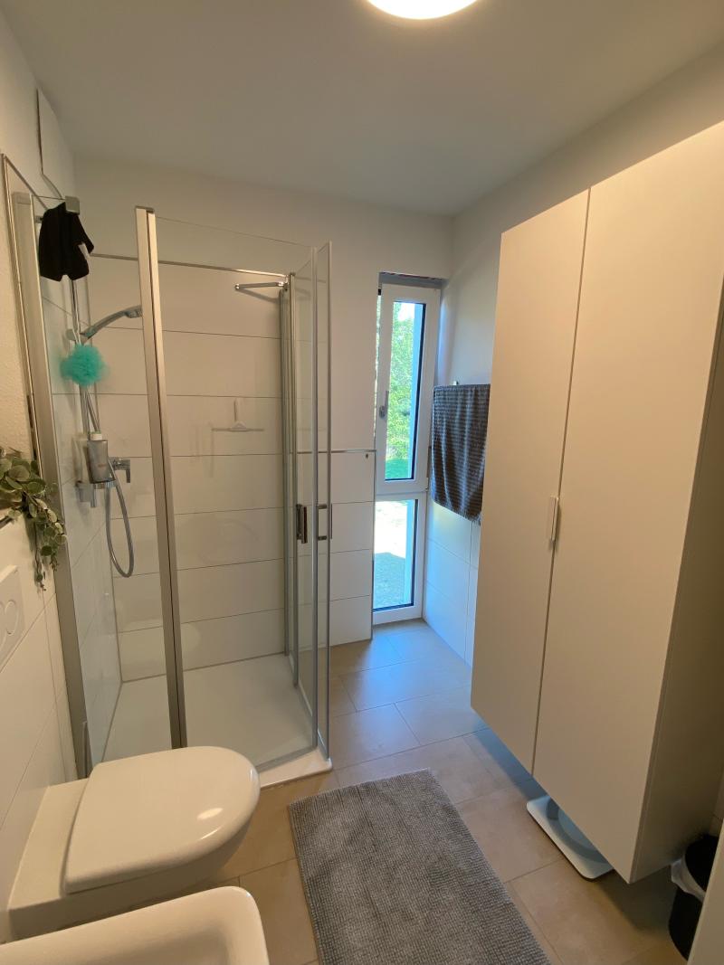 Das Tageslichtbad ist mit einer modernen bodengleichen Walk-In-Dusche, einem Waschbecken sowie einem WC ausgestattet.