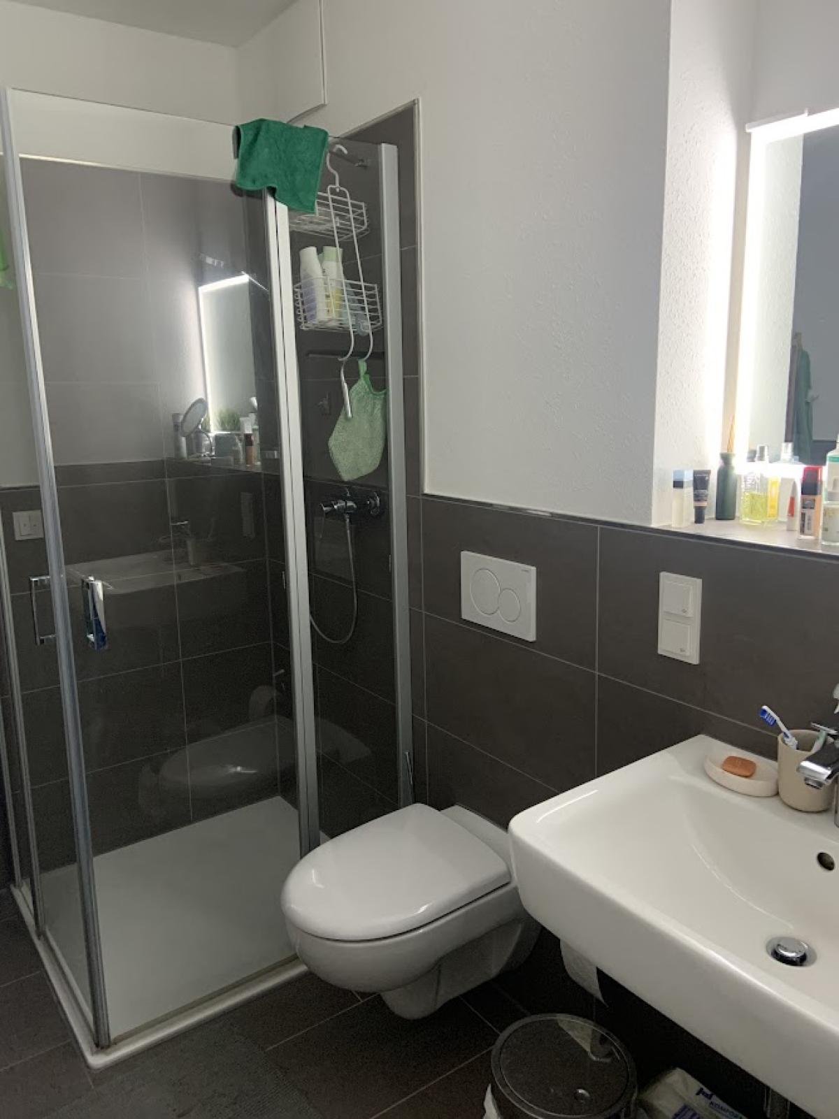 Das stilvolle Badezimmer mit Tageslicht ist mit einer bodentiefen Walk-In-Dusche, einem Waschbecken und einem WC ausgestattet. Liebevolle Details wie Laibungen im Toilettenbereich sowie oberhalb des Waschbeckens sehen nicht nur schön und zeitgemäß aus, sondern bieten zusätzliche Abstellfläche, um zum Beispiel Kosmetika in Szene zu setzen.