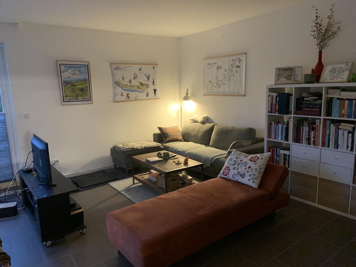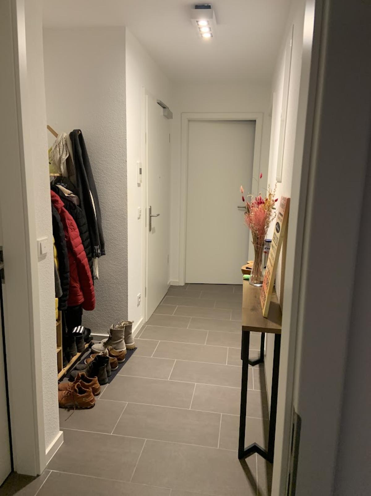 Die Wohnung ist in einem hellen grau gefliest und hat eine moderne Raumatmosphäre. Ein schöner Ort, um sich ein neue Zuhaue einzurichten.